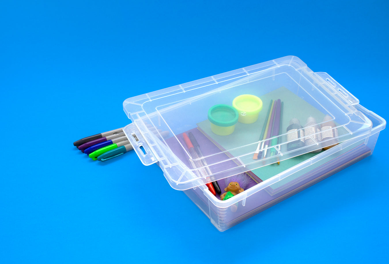 A deep, oversize A4 box with secure clip on lid, ideal for art supplies and stationery